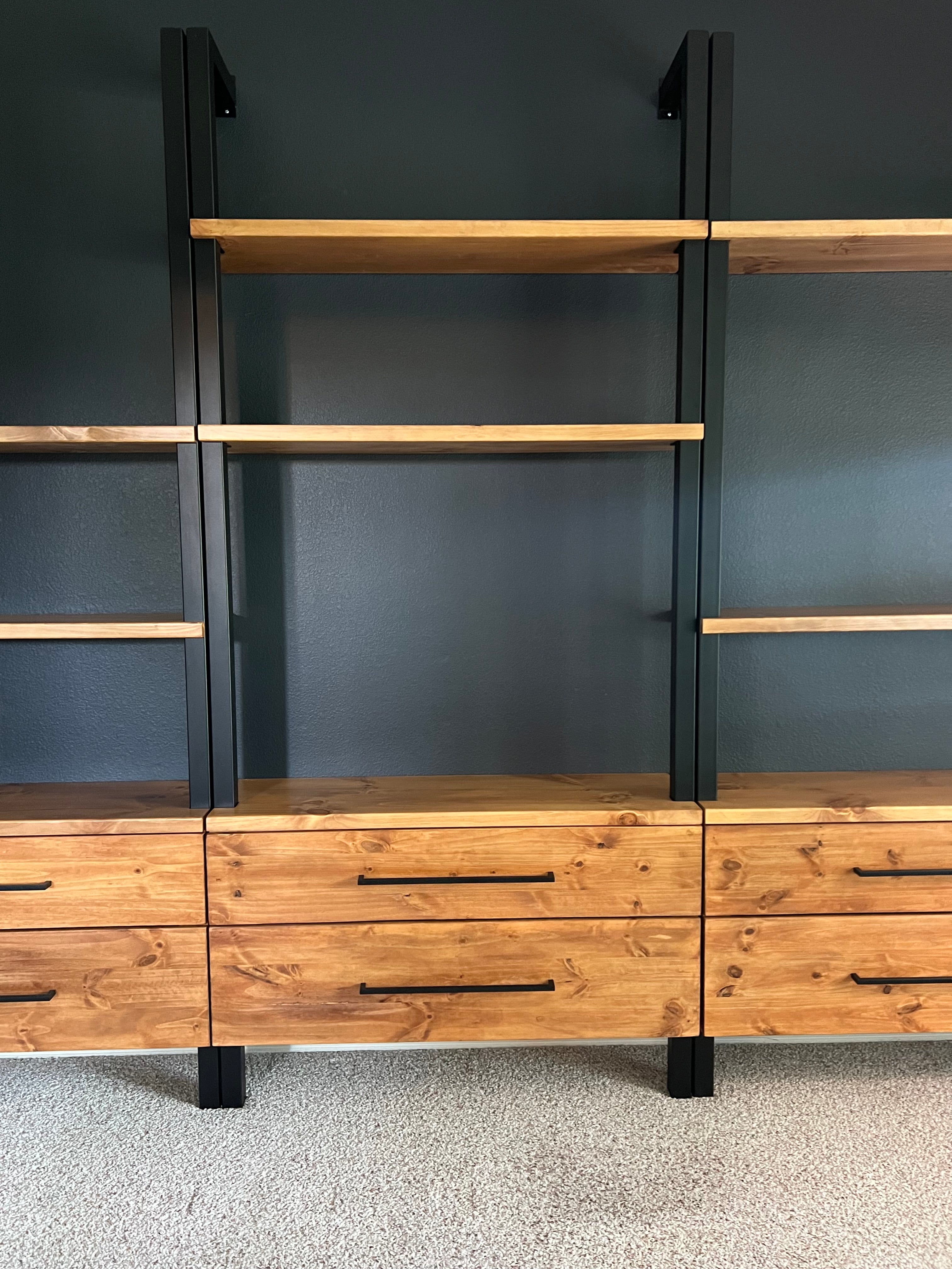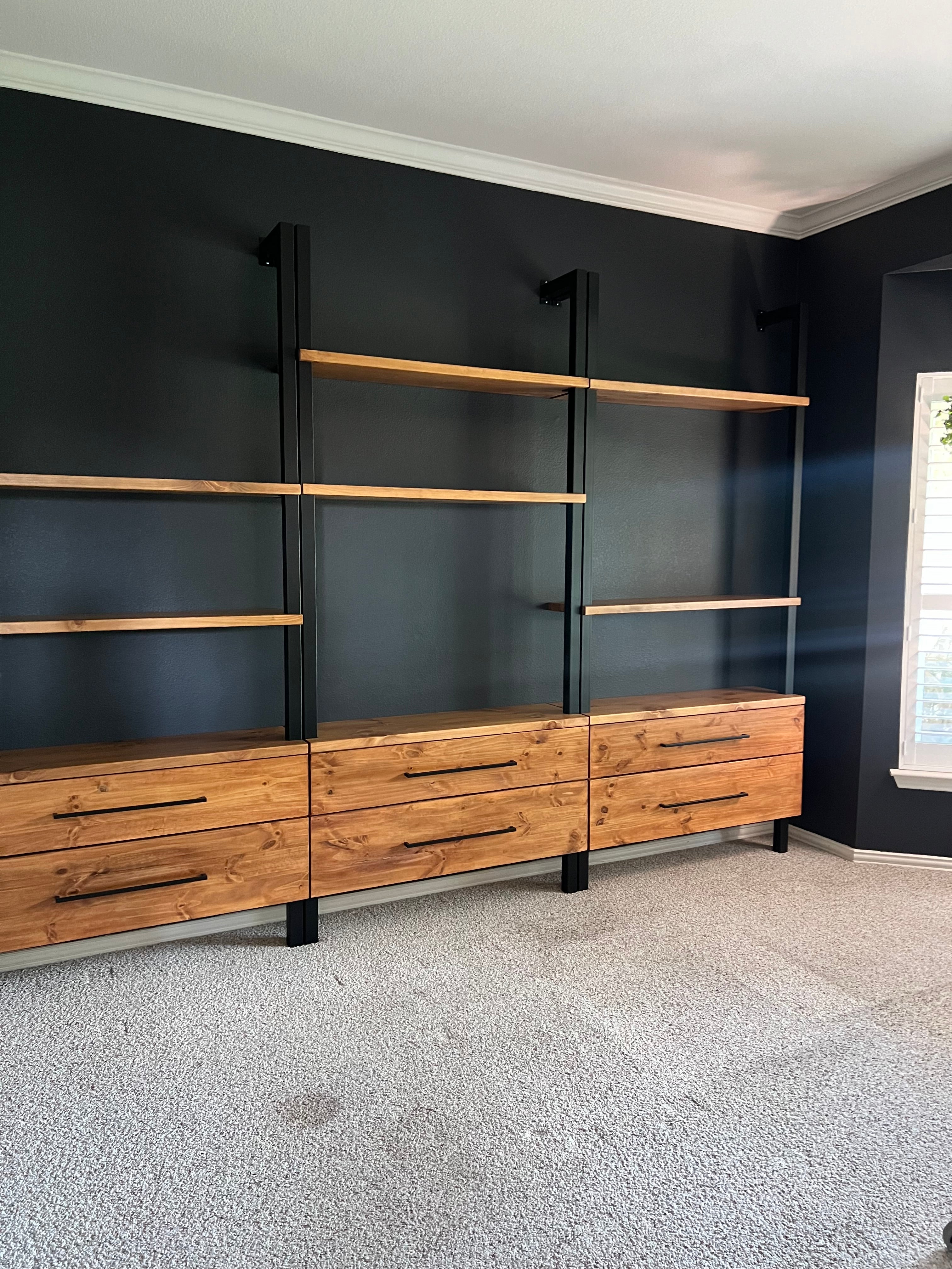- (1) Long Floating Shelf on top: 108" L x 10" D x 3" H