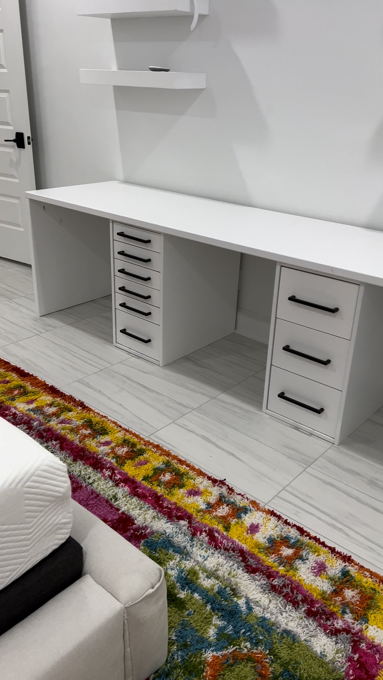 - Drawer tower on either side of the desk.