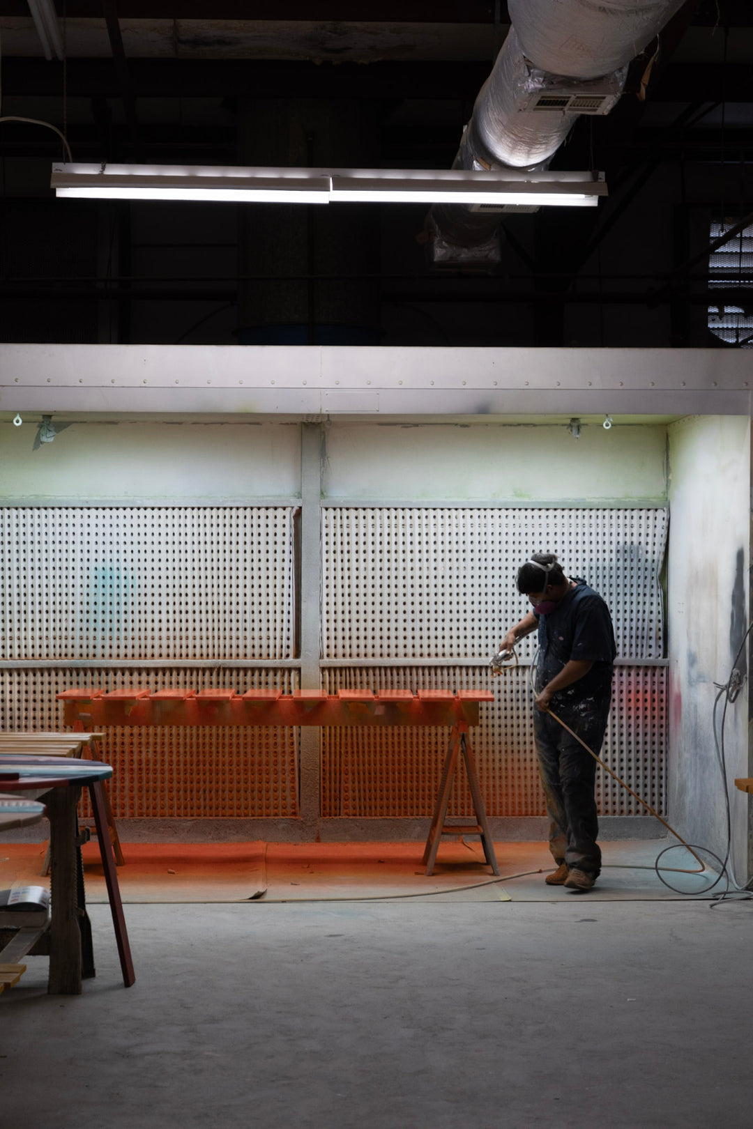 8-week project: 45 tables, 5 benches, and 8 chairs for a local restaurant in Dallas, TX. Crafted from Eastern White Pine and painted in various colors.