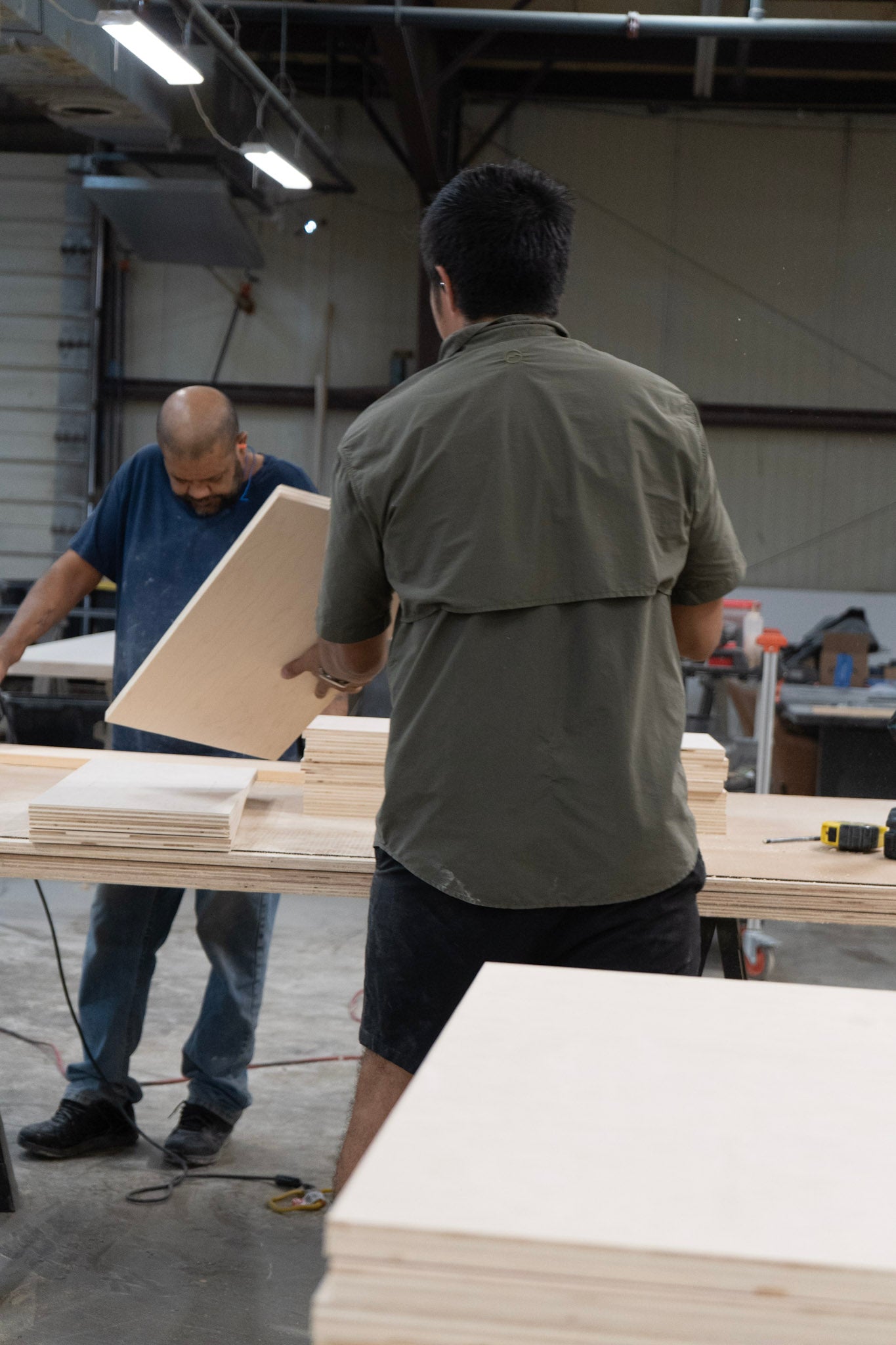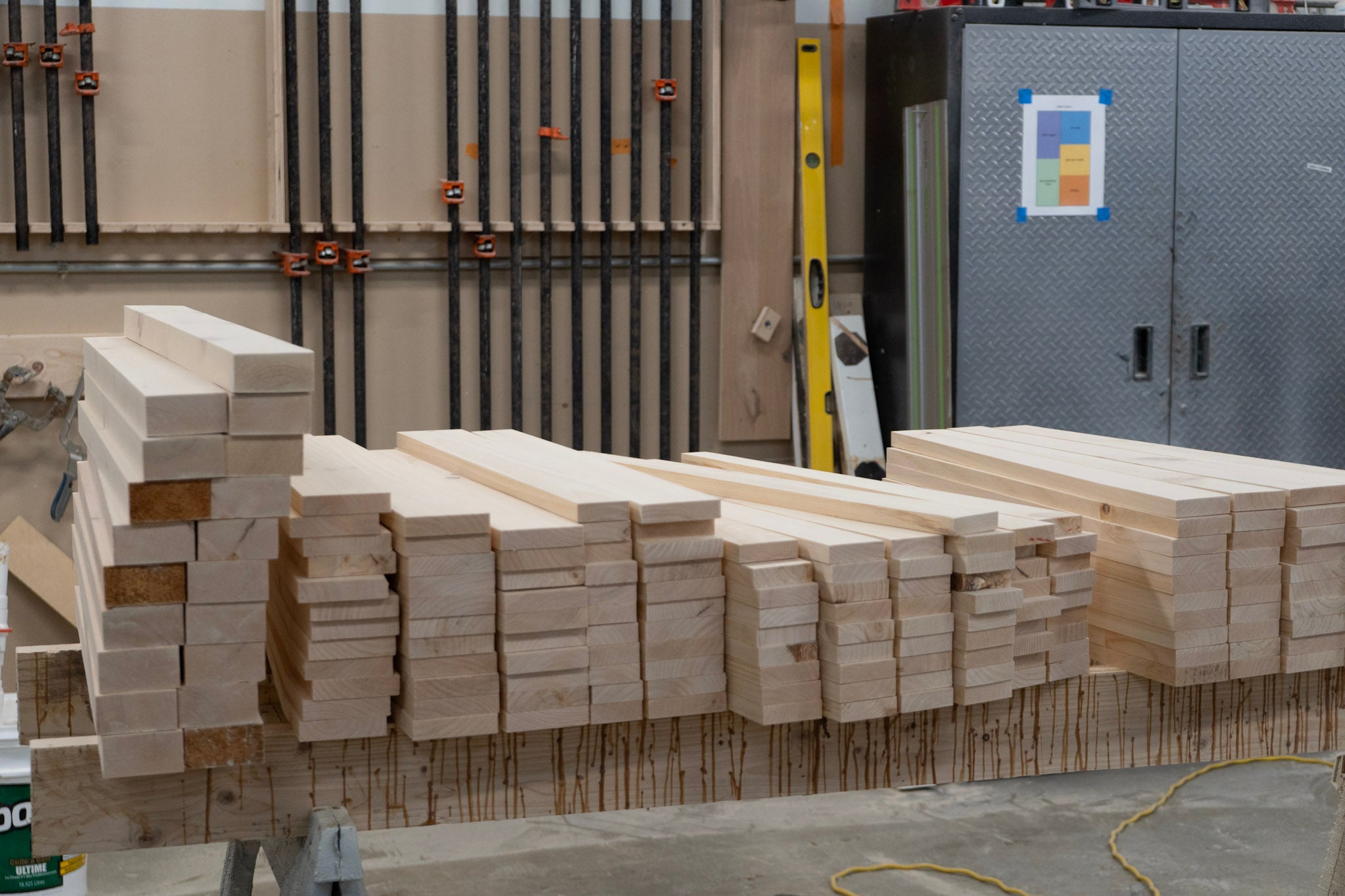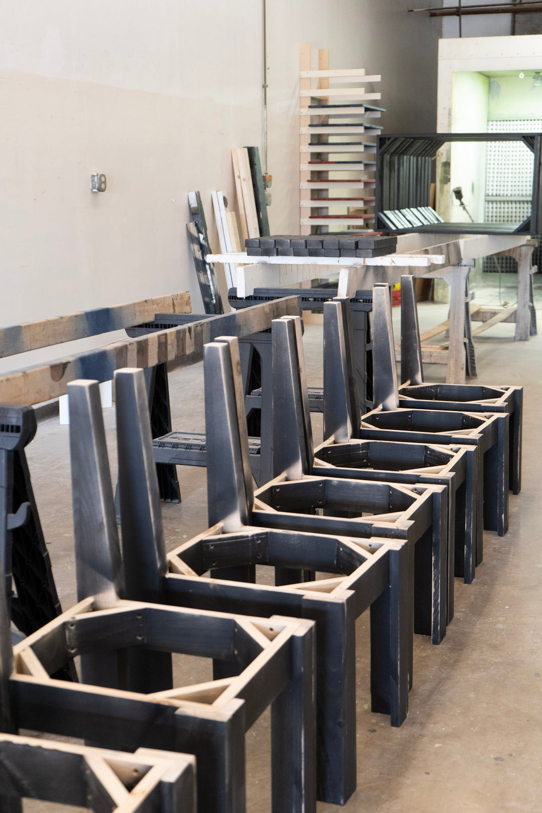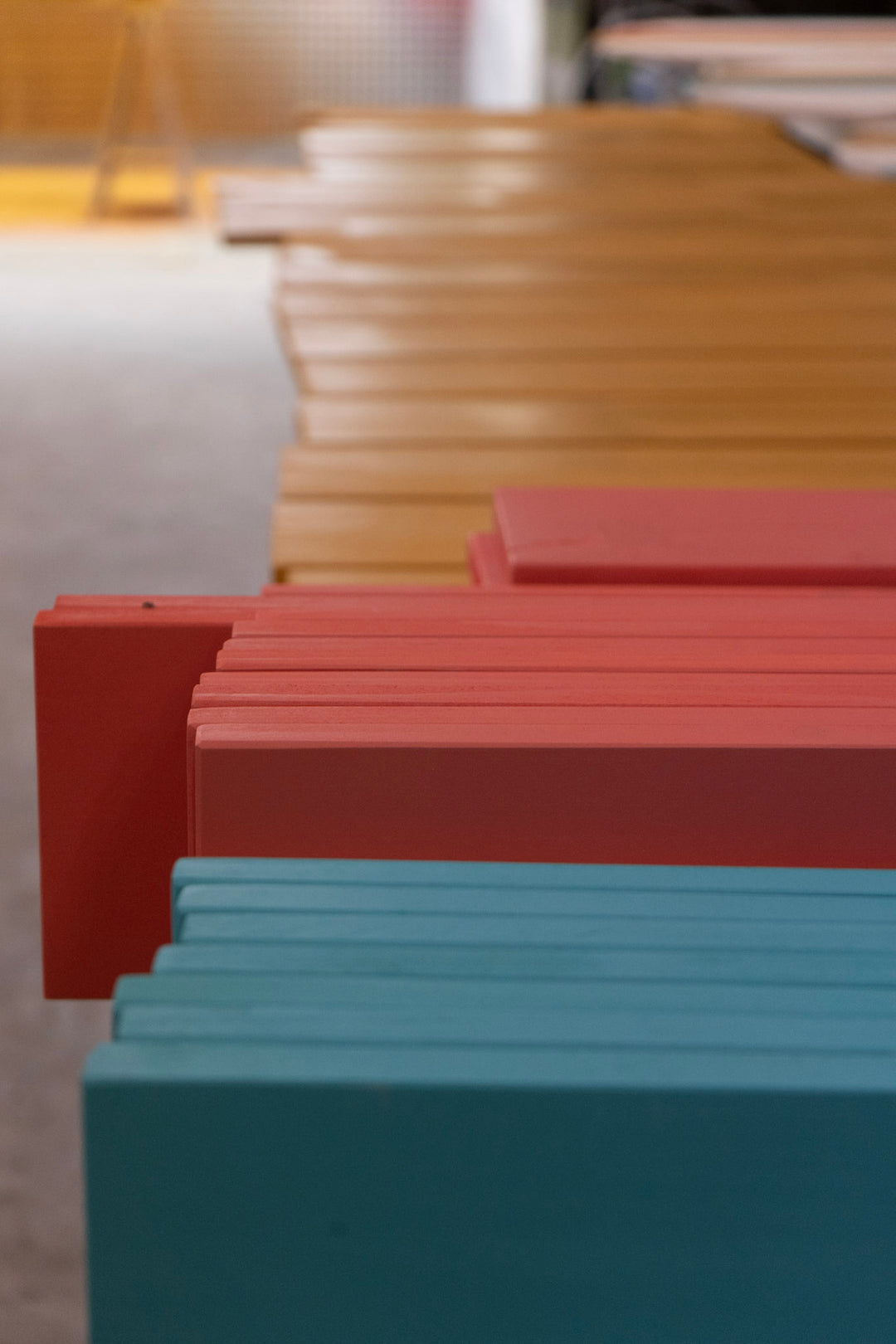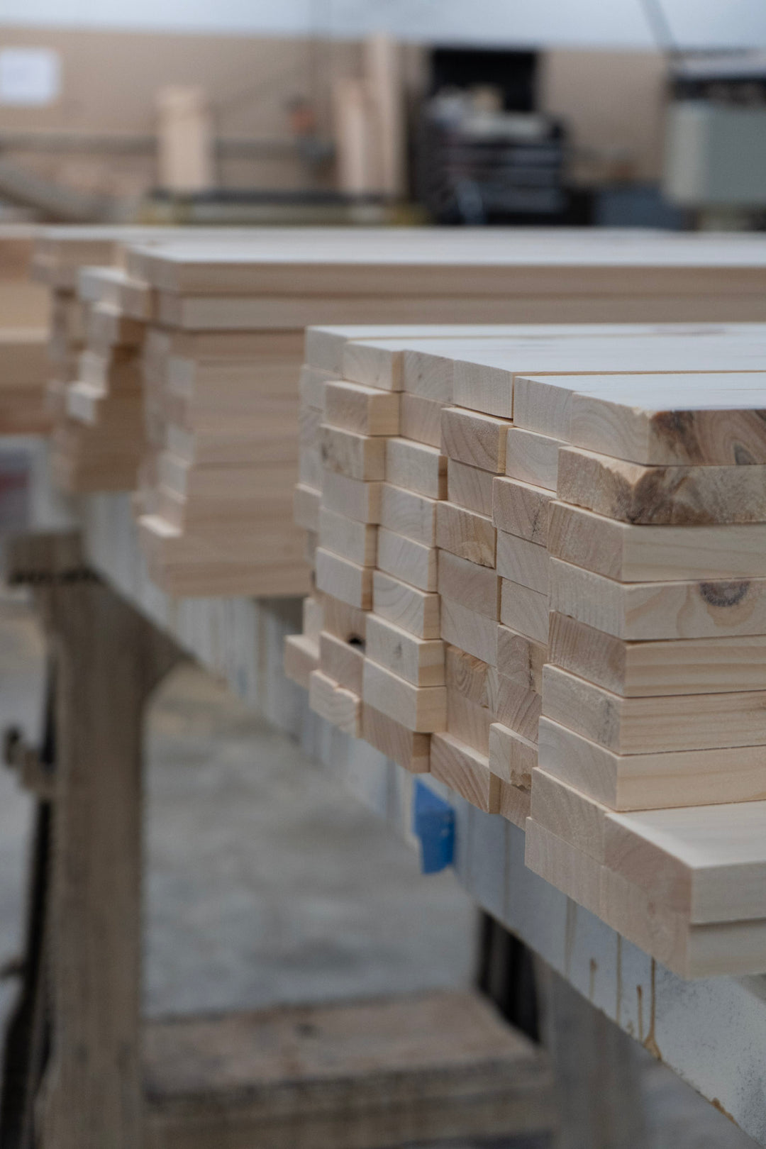 20 kids tables, 40 kids benches, and 20 guest benches made from russian plywood. They are ready to get painted white for a clean, bright look.