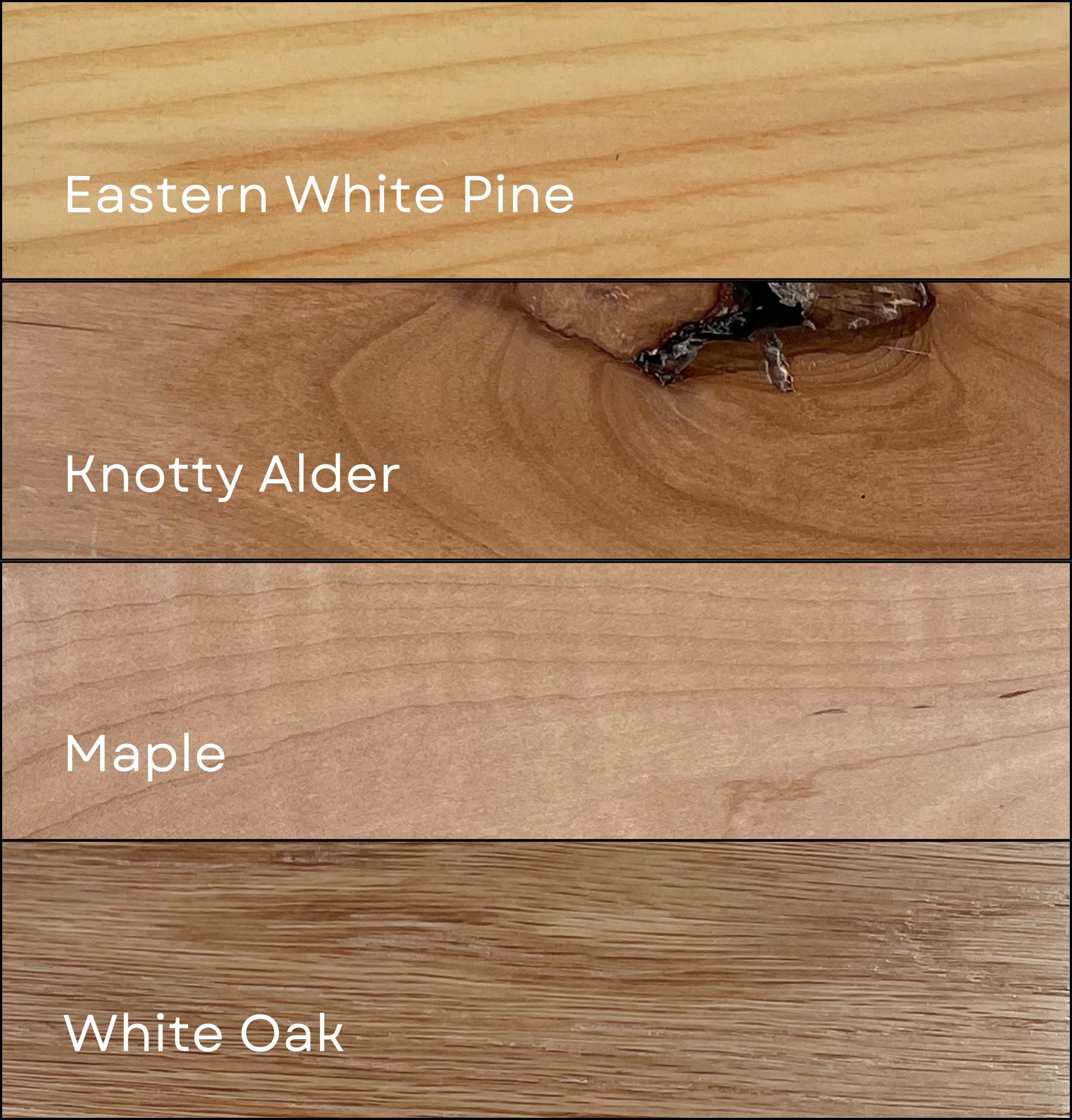 Our furniture is built from real, solid wood — no veneers, no shortcuts. Depending on the piece, we use hardwoods like white oak, maple, knotty alder, or eastern white pine — all hand-selected for beauty and strength. If you'd like to learn more about our wood options, click here.